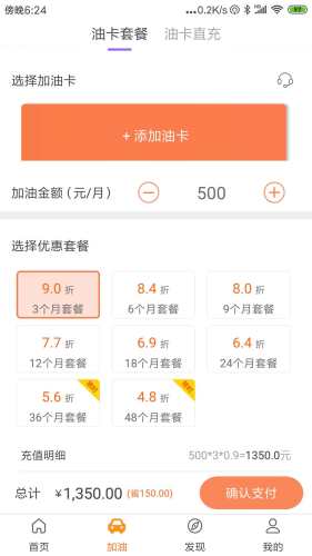 车宝宝加油APP提供加油卡线上充值服务,可选择“即时到账”与“分月到账”,