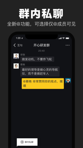 1、【群聊私聊】:全新@功能,可选择@部分成员私密聊天,无需为临时需求创建多个群组