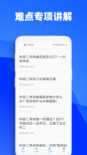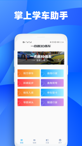 一点通3D练车,3D模拟掌上练车助手。软件通过图文视频,全方位讲解侧方停车、曲线行驶、斜坡起步等科目二考试内容,还有一些技巧,帮助学员轻松过考。