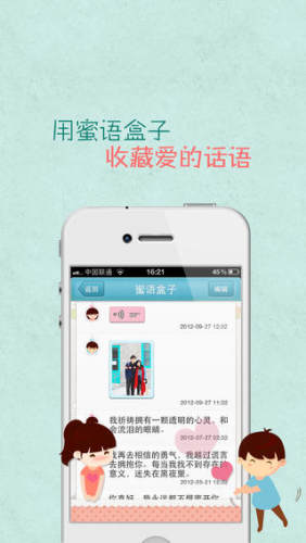 随时随地和TA蜜语传情。你可以给对方写一段甜蜜文字,也可以发一段甜蜜话语,甚至忙时不想打字发一个有爱的状态汇报。信息永久保存,即使误删应用,也能恢复蜜语信息。