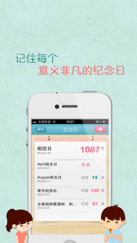 记住每一个意义非凡的日子。记录你们相恋多少天,第一次牵手时间…..当周年纪念日到来时,还可按照用户提醒的方式提醒。