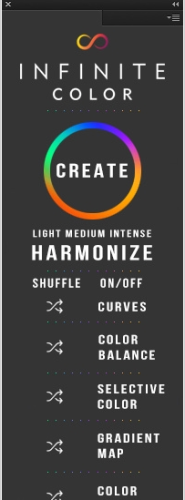 Infinite Color Panel是一款应用在Photoshop中的无限色彩配色、调色插件,能够随机产生无数种色彩效果,可以通过曲线、色彩平衡、色彩选取、渐变贴图、LUT预设多种方式来对图像进行色彩调节,使用起来十分方便,有需要的用户不要错过了,欢迎下载使用!
