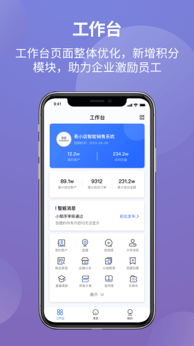 易小店App,工作台,工作台页面整体优化,新增积分模块,助力企业激励员工;商品管理,快速发布商品,一触即达;短视频管理,支持发布和管理短视频,5G时代让企业与个人风采展示更加生动;直播管理,开启直播,私域流量沉淀且更加精准;积分任务,做任务,赚积分,豪礼兑不停。