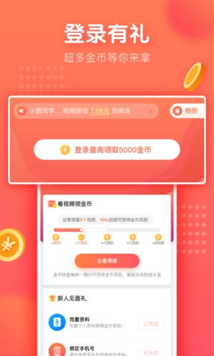 新用户登陆快手极速版,可获得金币,看视频能赚金币,看的多赚的多,邀请好友也能领金币,还有签到领金币,天天有钱领