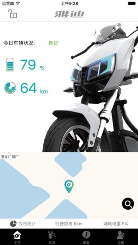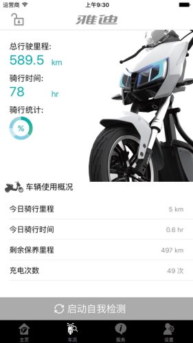 雅迪智能管家app是专为雅迪电动车用户制作,软件拥有骑行统计,自我检测,服务,设置等等功能,可以帮助用户更好的使用雅迪电动车。