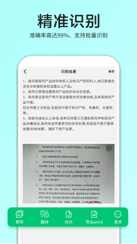 照片扫描仪app,是一款多功能图片扫描仪,支持商务合同、证件卡件、名片书籍、手写文稿等;精准识别,准确率高达99%、支持批量识别;编辑文档,生成PDF、添加签名、水印;拍照翻译,支持数十种语言识别、互译。