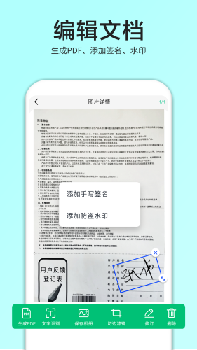 可以对扫描件、生成PDF、切边,加滤镜、手写签名,加水印,防止别人盗窃;