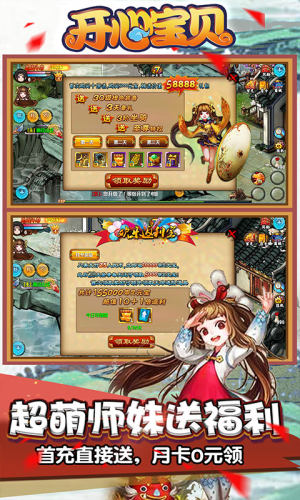开心宝贝送月卡打金版解锁超多首充,月卡福利,多款小师妹再度上线,御姐,温柔,女神,可爱等类型全都有,培养小师妹好感度,一起共游武林江湖精彩。