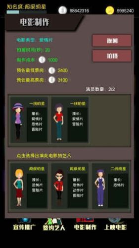 2、可以签约其他艺人,拍摄属于自己的电影,获得丰厚的票房收入。