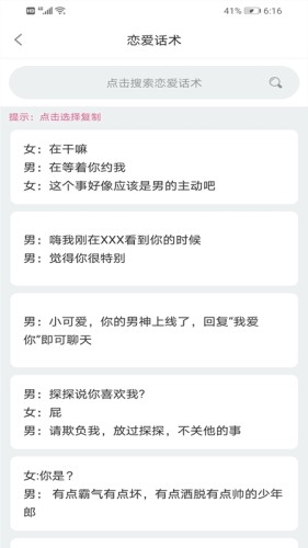 谈恋爱技巧app是一款非常好用的手机在线交友互动话术指导平台。专业优质的搭讪聊天交友话术,为你的爱情保驾护航,非常的实用。感兴趣的朋友不要错过,快来下载体验吧。