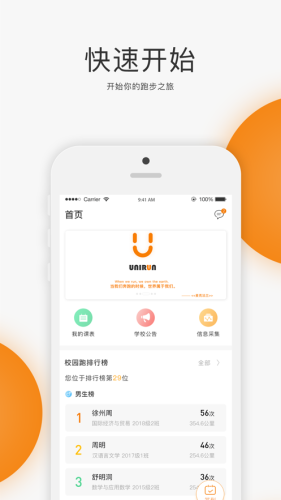 UNIRUN是一款鼓励高校大学生走出宿舍进行体育锻炼的督促型应用,可以将学生身体素质与运动情况信息化后反馈给老师,