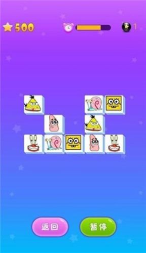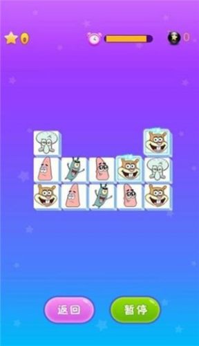 海绵宝宝连连看,它以可爱又搞笑的海绵宝宝里的人物为主题的小游戏,海绵宝宝、派大星、章鱼哥、蟹老板等等人物都登场了,赶紧把他们一一消灭吧,