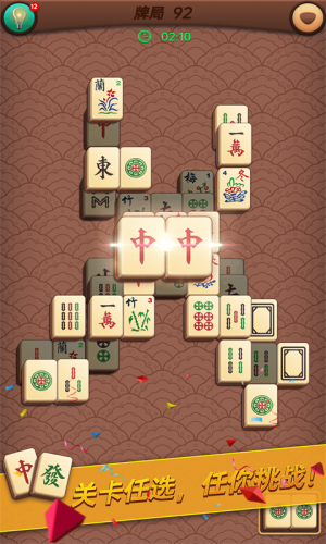 麻将对对碰是一款以麻将为题材极具中国韵味的连连看消除手机游戏,玩家只需要通过触屏点击相同花色的麻将牌并使其消除,直到全部消除完毕即可获得通关,游戏提供了上千关卡和多种背景供玩家选择,消除越快,奖励越高,极具乐趣,签到还能领红包,还支持提现,感兴趣的朋友欢迎下载体验。