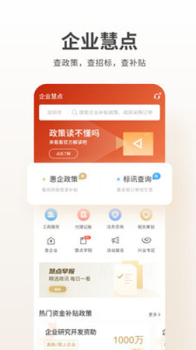 企业慧点,是一款为深圳地区的企业提供政策服务的工具,提供立体化的政策服务,集惠企政策归集、大数据智能匹配、政府补贴及权威解读等多重功能于一体。