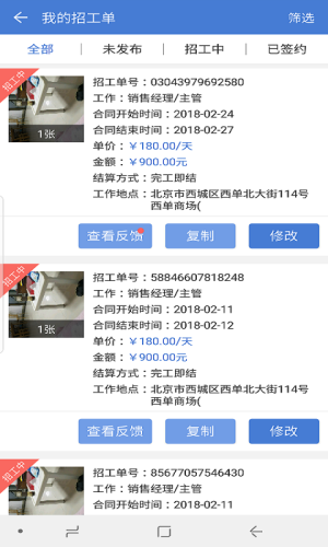 如劳方认为修改资方招工单条款后可成交,劳方可修改招工条款,保存后资方收到修改的工单,如认可劳方修改条款,可直接同意签约。