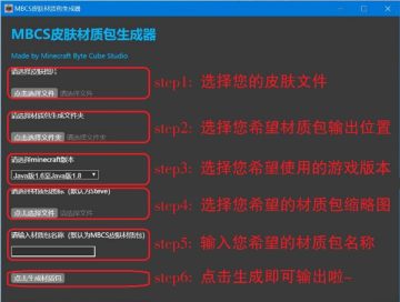 MBCS皮肤材质包生成器是一个可以生成Minecraft皮肤材质包的程序,一个软件轻松搞定皮肤材质包的制作,软件全傻瓜式操作,一看就懂,不学都会,人人都能自制一个属于自己的皮肤材质包!