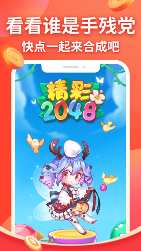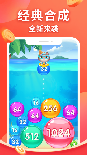 2048玩法的益智休闲类手游,游戏画风清爽明快,玩家在游戏中需要释放带着数字的小球,将小球合并在一起形成2048,就能轻松赚取红包!