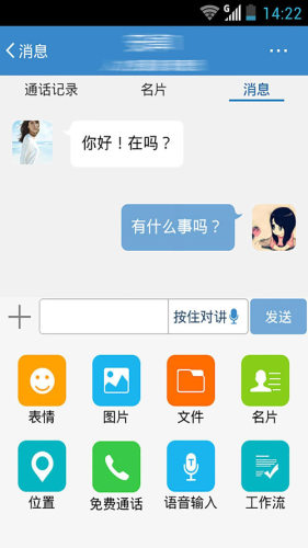 1、工作组聊天添加按住对讲、发送文件、图片、位置、名片功能