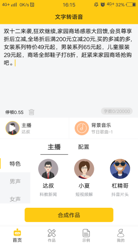 广告配音大全是一款专业广告叫卖配音、文字转语音、语音合成、在线朗读的APP软件。输入文字秒转语音,免费试听,在线导出。