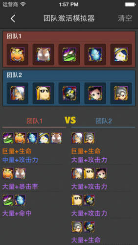 可根据玩家选中卡牌给出激活的组合技效果,并且可通过两组卡牌的对比选出一组最靠谱 、实用的队伍!