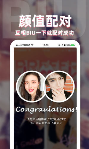 (根据照片看脸交友)手机主页每次推荐两个用户进行筛选,用户可从两个用户中挑选一个进行关注。用户通过上形象照片与其他用户匹配,如果双方互相BIU了对方则可进行聊天。