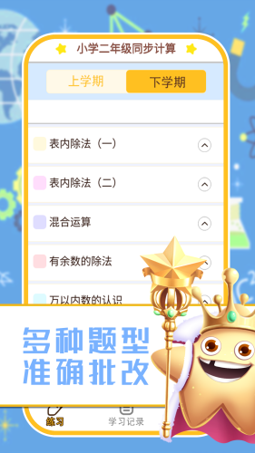 《二年级数学同步习题》是一款专门为小学二年级学生打造的教育应用软件。本软件集合了二年级数学上下册全部的教学内容,支持口算题、竖式计算、混合运算等各类型题目。通过人工智能和大数据分析,涵盖了小学二年级课题教材90%的题库。 挑选好题,根据学生薄弱点评测结果,推送本地化个性化的习题练习,并且自动收集错题,进行针对化练习,在很短时间内获得好的学习效果。当然家长或者老师可以在线打印习题,实现轻松辅导与教育。