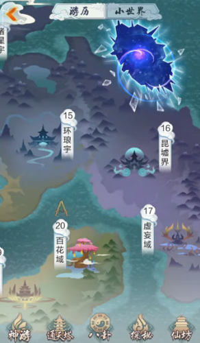 神游后去探索天图一对应的小世界,给法宝图纸,探索已经开启的小世界,给法宝升级材料。(小世界在游历里最上方偏右)