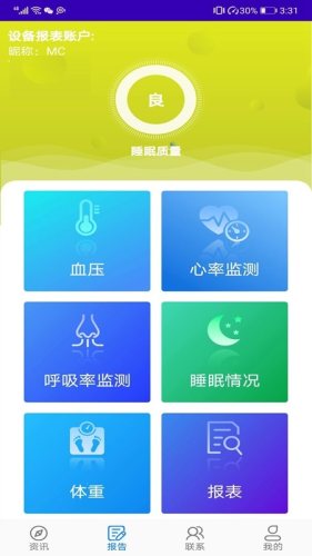 康智颐手机端主要的功能模块有:对人体的睡眠情况、心率监测、呼吸与鼾声、血压、体重、预警、报警等进行监测结果进行可视化查询和展示