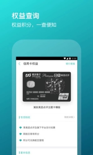 2、信用卡权益积分查询:卡片权益详情、积分年费信息一目了然;
