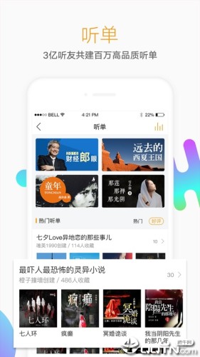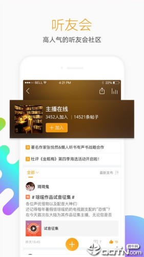 听吧社区:UGC频道,汇聚大量国内主播上传分享的网络电台节目,节目以脱口秀、心情讲述、笑话段子、健康养生、广播剧为主。普通用户可以在社区内关注主播和订阅节目,可以分享交流有声阅读资源。