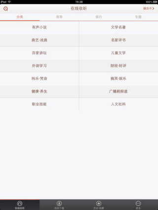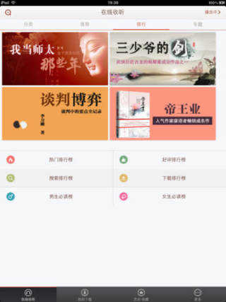 懒人听书iPad版专为爱书之人准备,懒人听书彻底改变了阅读的方式,解放了你的双手双眼,你的阅读从此不再受时间、空间的影响,你可以随时随地都能听书,坐着听、躺着听、睡着听都行,随你喜欢。