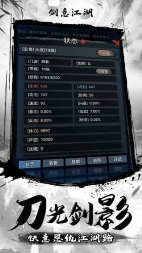 剑意江湖,一款水墨风格的文字mud游戏,你有着大侠的梦想,在刀光剑影中野蛮成长,找到你喜欢的门派,拜师进入,和江湖上的好汉结义,或者寻觅知心爱侣,这是真实的江湖世界。