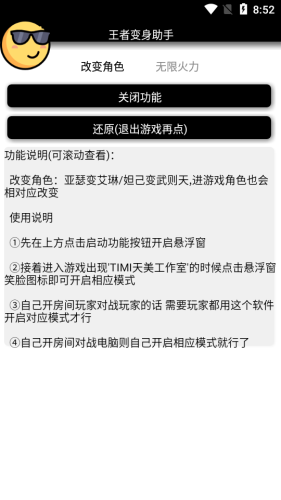 王者变身助手App支持一键英雄替换,让你在游戏中免费体验绝版英雄角色,亚瑟变艾琳妲己变则天,并且还支持切换无限火力模式,无限金钱技能无冷却。
