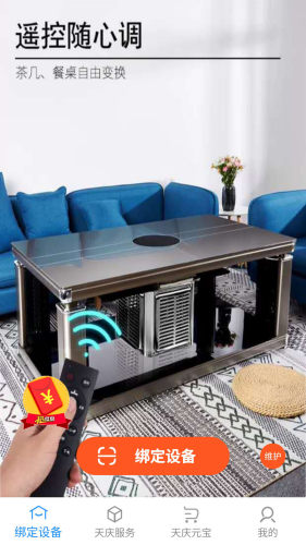 天庆智能app,贵州云取暖智能客户端。软件支持天庆旗下智能取暖设备连接,绑定后即可在手机上实现远程遥控,茶几、餐桌自由变换等功能,为家庭取暖提供一个智能的解决方案。