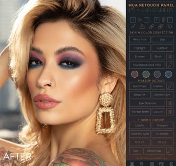 MUA Retouch Panel皮肤美白润饰磨皮扩展面板插件是一个智能的Photoshop插件,扩展设计时考虑到化妆师产生微妙的,直观的,广告系列级润饰。由美容摄影师和修图师Julia Kuzmenko McKim以及化妆师,摄影师和修图师Jordan Liberty在Beauty Industry中工作多年开发而成,面板脚本现在仅供MUA Retouch面板用户使用。您无需成为Photoshop专家就能成功使用它。MUA大多数按钮使用通用的化妆品名称并模仿实际化妆品的效果,因此您可以快速浏览面板的各个部分并轻松确定每个按钮的用途。