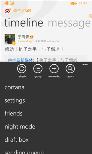 wp手机用户也能便捷使用新浪微博啦,随时查看微博、分享微博不再是问题!新浪微博wp客户端集合了阅读、转发、私心、关注、发布、评论等微博核心功能,