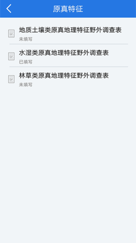 其中原真特征调查模板针对水湿类、林草类、地质土壤类三种不同的原真调查点分别设定了调查模板。