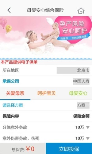 母婴安心保险关注孕期及分娩风险。是为孕妈妈及其新生儿量身定制的保障全面、保期长达一年的风险防范措施;按照不同年龄段进一步细分,满足个性化需求。涵盖孕期及分娩意外风险的同时,还提供对常规意外伤害风险的防范,保障全面、贴心。