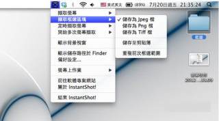 InstantShot创建菜单栏中的一个图标。点击图标,会出现一个菜单。从菜单中选择的拍摄类型(整个屏幕,屏幕的一部分,定时截图或多个捕获),或者,如果你想改变保存格式,然后从子菜单中选择所需的,然后...捕捉!
