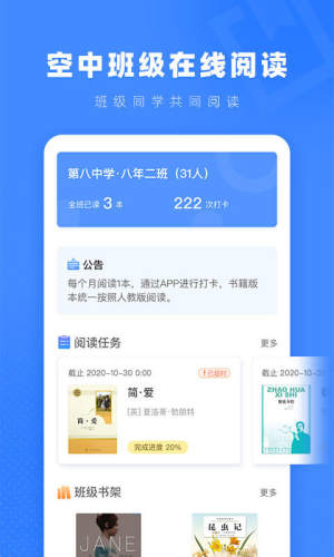 小a阅读为每本书籍都配套了精选的阅读习题,提升阅读效果;同时小a阅读提供在线加入班级,可以与大家一同在线阅读,在线完成老师布置的阅读任务,赶快下载体验吧!
