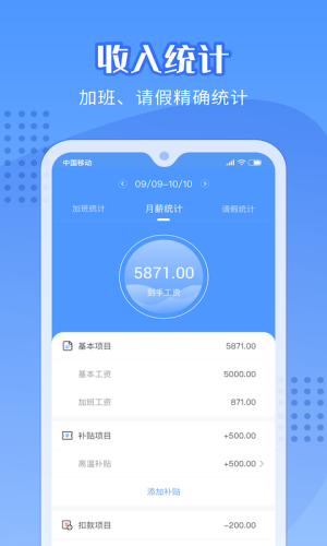 4、自动汇总月度工资,加班/请假明细一目了然。