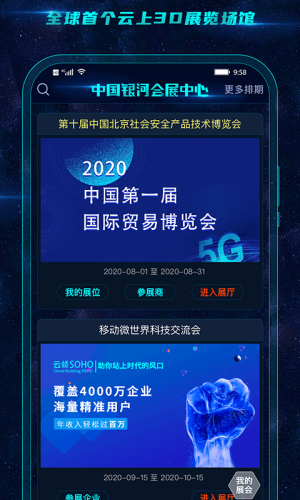 中国银河会展中心App,云上参展,云上逛展,足不出户,看尽天下展;全球首个云上3D展览场馆,云上云霞同步展览,360度真实场馆展示;参展商:低微成本惠享海量资源,直接匹配精准用户;采购商:跨越时空,畅览全球会展,一触即达。