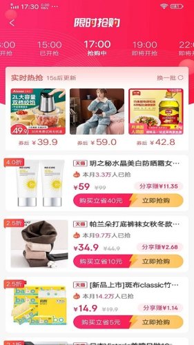 *大牌云集:对接各大电商平台,大牌云集,超级返,限时秒杀,买的更放心,用的更安心。