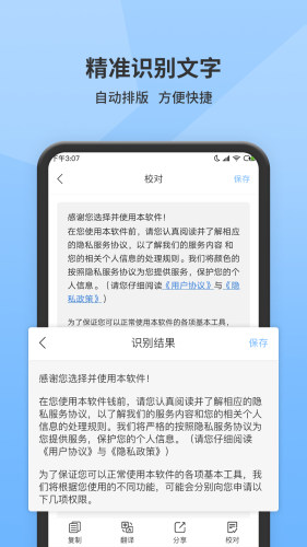 【文字识别】精准识别,准确识别率高达99.9%,一键拍照即可快速识别出图片中的文字,操作简单直观。