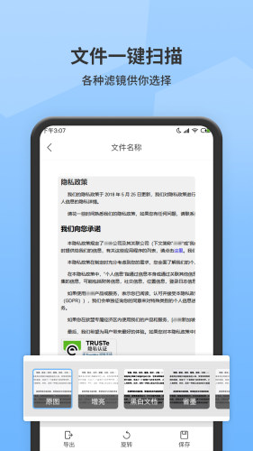 【文件扫描】支持多种文件扫描,能完美的扫描身份证、银行卡、营业执照、护照、驾驶证、行驶证生成PDF,出门办事将会更加方便。