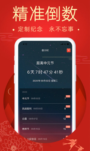 · 倒计时:帮你记录生活工作中的重要日期,以及传统节日、二十四节气,让你不再错过每一个值得纪念的日子。
