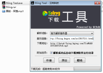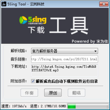 1、开启软件后,选择“官方解析服务器”的解析线路,将5sing的音乐链接粘贴上去后,将附加选项勾选上即可,可以选择下载伴奏、原创或者翻唱文件。