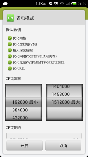 以下设置以主频2.2G的CPU为例,此例手机比较好,频段也多,如果你的手机主频不高,请尽可能用你的CPU高频段,减少手机迟钝。