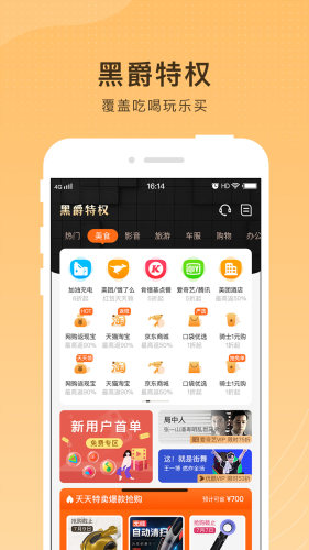 黑爵特权汇聚了超过200项的特权权益,还包括众多合作方的优惠券、打折卡、体验卡等,覆盖了餐饮、娱乐、出行、生活、电商、旅游、购物、休闲等方方面面,同时与淘宝、天猫、拼多多、京东、网易严选、考拉海淘等知名电商平台合作,给用户更多等返利。