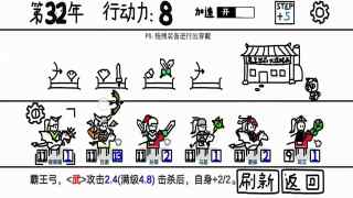 行动力为操作步数,酒馆→招募英雄(英雄分文武、基础属性就两个:攻击和防御),武器店→+攻击,服装店→+防御,马场→+闪避,南北货→药品(+血+基础属性,以及其他奇奇怪怪的东西),初始抽卡大概率会随机给个英雄。一般初始抽卡大概率会给英雄,当然给行动力也没关系,都是要在酒馆进行招募的,招募后按照刚刚那些说明给英雄加属性,(噢,三国主题,三国知名人物属性都蛮高的。另外注意每一步操作都会消耗行动力,所以一定要想好再动),然后点击“下一年”就是进入战斗,战斗胜利会进入下一年并给行动力,继续招募、养成,哦对,战斗也是会加经验的,点击页面左侧的按钮可以看各英雄属性以及武器等级。